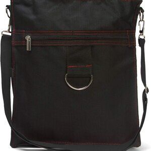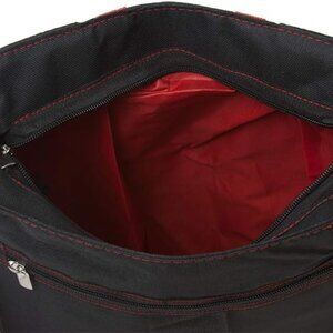 product NEW georgeous red / black corset style sling bag! Great for clubing, or work! This is a strong and sturdy bag, with thick canvas material and nylon lining. It comes with adjustable strap, cell pocket on each side. There is a zipper pocket on the back outside. Flap snaps shut. Top Zipper closure and inside pouch.