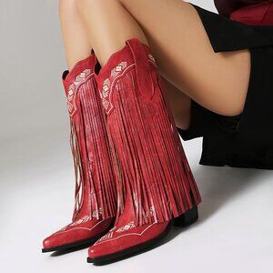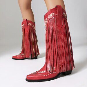 ⚡Women's Red Embroidered Fringe Pull On Mid Calf Chunky Block Heel Pointed Toe