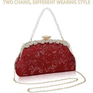 ⚡ Women's Red Fabric Lace Pearl Chain Rhinestones Shoulder Clutch Bag