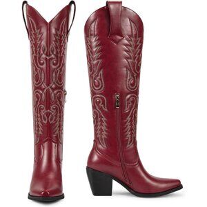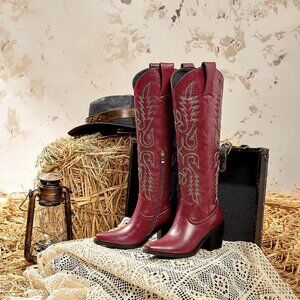 ⚡Womens Red Faux Leather Cowboy Side Zipper Knee High Chunky Heel Boots