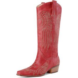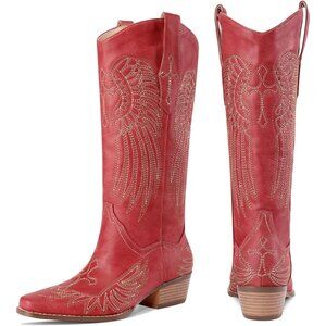 ⚡Womens Red Faux Leather Knee High Cowboy Chunky Heel Tall Western Boots