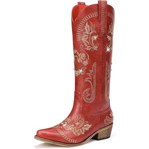 🆕Womens Red Faux Leather Knee High Cowboy Chunky Heel Tall Western Boots