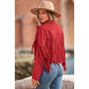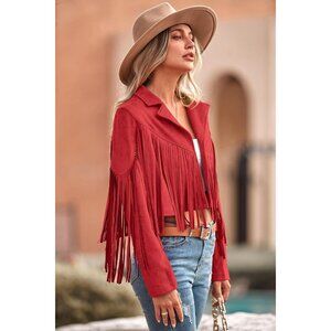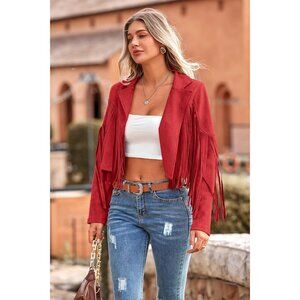 Women's Red Fringe Faux Suede Leather Tassel Motorcycle Cropped Jackets
