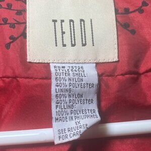 This stylish red jacket features a charming tree print and a full zip closure. Designed for warmth and comfort, it's ideal for chilly days. Black trees raised detail. Lightweight