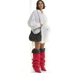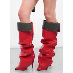 ⚡Women's Red Knee High Shark Boots Pointed Toe High Heels Ruched Stiletto