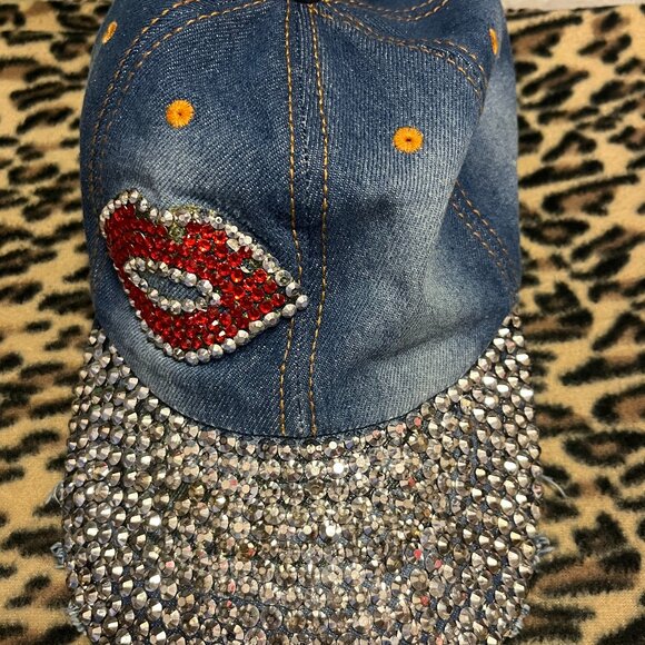 Women's Red Lips Bling and Denim Baseball Hat Adjustable and excellent used condition.