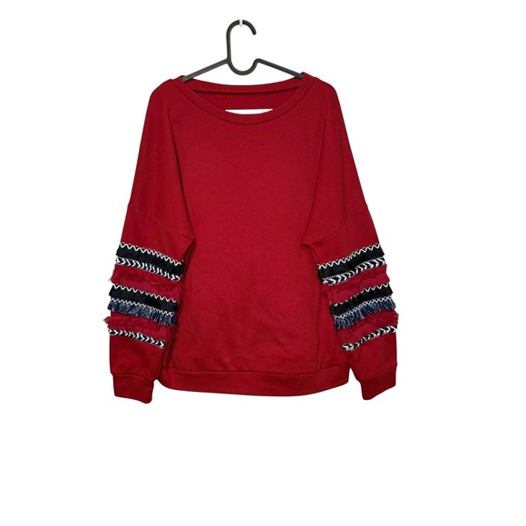 Keywords: red sweatshirt, womens sweatshirt, long sleeve sweatshirt, pullover sweatshirt, fringe trim, bohemian sweatshirt, casual top, shein sweatshirt, size L, ladies sweatshirt, comfy sweatshirt, fashion sweatshirt, red top