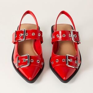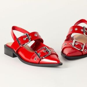 These vibrant red flats feature a sleek pointed toe and a stylish slingback design. Made from glossy patent leather, they are adorned with bold silver buckles and edgy silver studs for a modern touch. Perfect for adding a pop of color and elegance to any outfit.