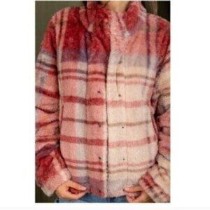 Womens Red & Pink Plaid Fuzzy Jacket/Shacket Soft Button-Up Coat Winterwear -NEW