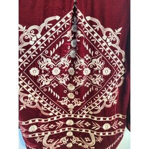 Features: Red and navy plaid pattern. Soft woven fabric front. Rich burgundy velvet back with intricate ivory embroidery. Long sleeves with button cuffs. Button-down front. Relaxed oversized fit