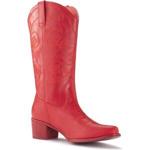 Women's Red Pointy Toe Faux Leather Western Cowgirl Mid Calf Boots