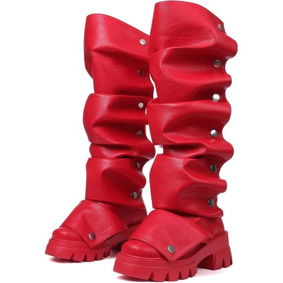 Women's Red Pu Fold Over Knee Slouchy Ruched Stacked Heel Round Toe Boots