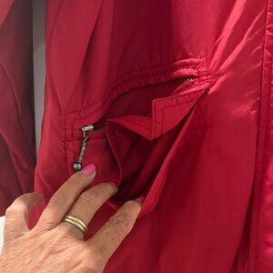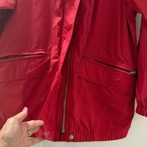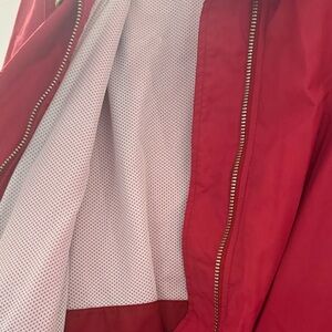 Bold crimson jacket with zip and flap pockets. Lightweight and practical design. Generous sizing.