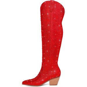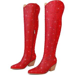 ⚡Women's Red Rhinestone Over the Knee Cowboy Boots Sparkly Bling Zippers