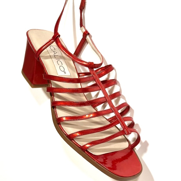 Red dress sandals / patent finish / straps / block heels - provide perfect balance of comfort and height. Made in Brazil from manmade material. Stretchable backing allows for easy wear. The original size shows 9, but they run half size smaller. Never been worn. keyword: vegan leather, imported, versatile
