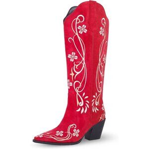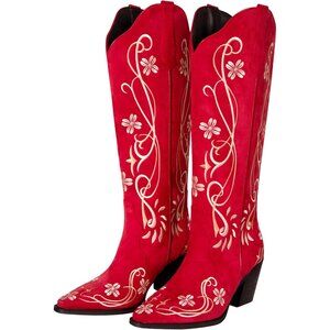 ⚡Women's Red Suede Knee High Boots Embroidered Pointed Toe Chunky Heel