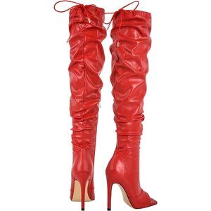 Women's Red Synthetic Stiletto Heel Zipper Knee High Toe Pull on Long Boots