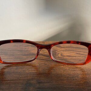 These eyeglass frames are pre-owned but remain in good condition with only light signs of use. The tortoise red front frame and blue arms show minimal surface wear consistent with gentle use. Hinges are intact and arms open and close smoothly. Stylish, durable, and ready for reuse as fashionable eyeglass frames.