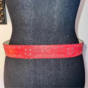 Women’s Red Vegan Leather Western Brushed Silver Tone Studded Tooled Belt with Brushed Silver Tone Buckle IN EXCELLENT CONDITION!! Size: S/M ***Styled on a size 4 mannequin****