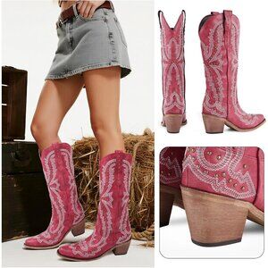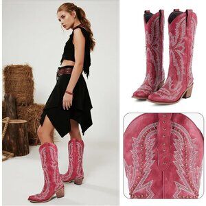 ⚡Women's Red Western Cowgirl Boots Embroidered Knee-High Comfortable Vintage