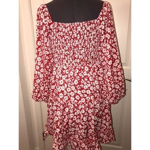 Women’s Red & White Floral Dress, LARGE, Smocked, Tiered Sheer