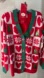 Charming oversized cardigan with heart and snowflake patterns. Features vibrant red and green colors. Perfect for holiday celebrations.