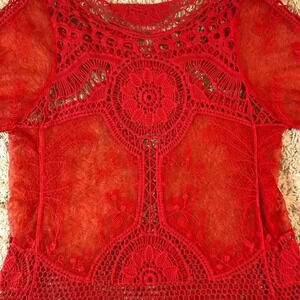 Beautiful red sunburst crochet top, a bright red, round neck, crochet blouse, 3/4 sleeve, there are no tags, flat lay measurements are as follows: Approx 19” pit to pit, Approx 26” long, no flaws or damages, From a Smoke Free & Pet Free Home; Top Rated Seller, Super Fast Shipper, Open to Offers ⭐️BUNDLE 2+ Items for an EXTRA 20% Off AND to SAVE on SHIPPING!⭐️