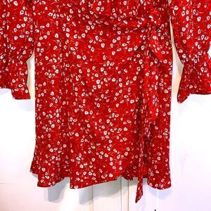 Women’s Red Floral Mock Wrap Knee Length Long Sleeve Lightweight Dress Size L