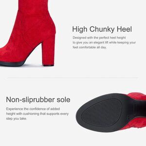 Decorate leg shape:Leg lengthening.These fitted thigh high boots will give the lengthening look to your legs.They feature premium quality stretchy faux suede, round toe, high chunky heel and partial side zip closure