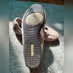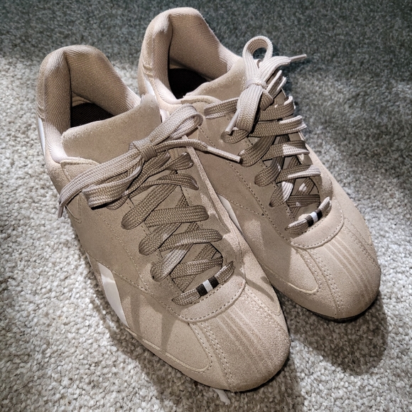 Size 7.5, tan and white rbk (Reebok) shoes. Preowned but in great condition.