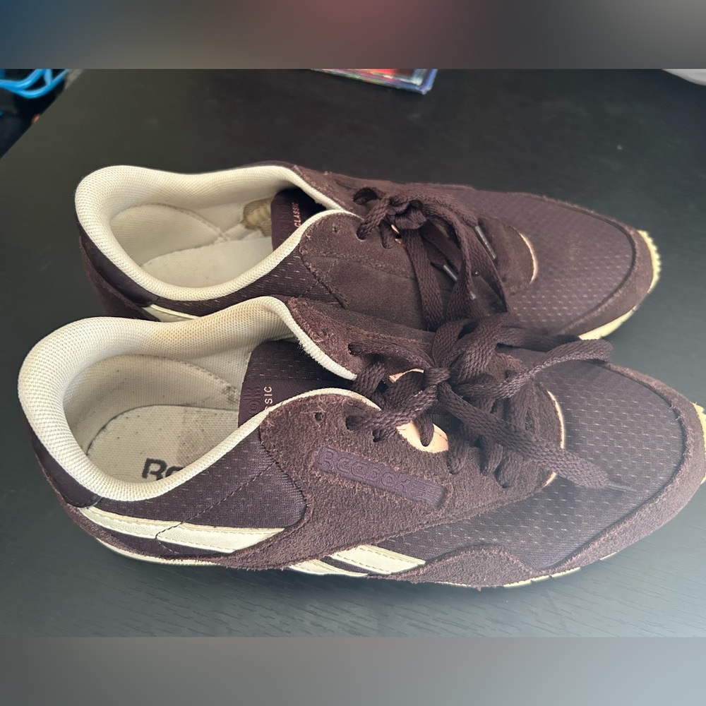In good used condition a pair of womens Reebok classic shoes. Look at pictures before purchasing. Thanks