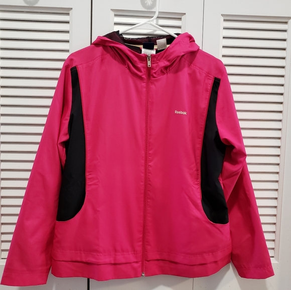 Like new pink and black womens Rebebok jacket. This lightweight rain jacket is perfect for cool autumn or spring days.