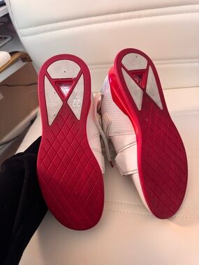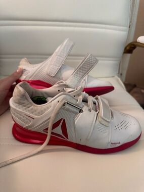 White and hot pink! Super cute lifters in good condition! Can be cleaned up with a magic eraser.