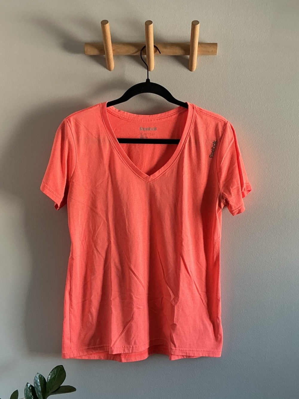 Women's Reebok V-neck tee in bright coral. Size large.