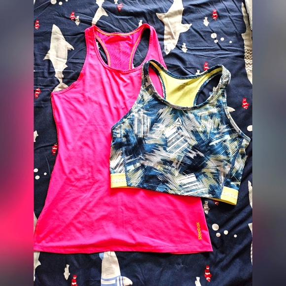 Women's size L Reebok Tank and sport bra/crop top bundle. These two items are in almost new condition. (The sizing info is coming off the top but it's in perfect condition) These were barely worn. Beautiful vibrant colors. They just didn't fit me and I'm so disappointed - SUPER cute tops!