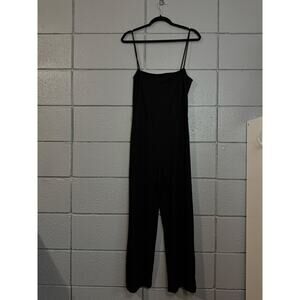 A one and done kind of thing. This jumpsuit is tight fitting in the bodice with a wide cropped leg and non adjustable spaghetti straps. It gives you a little shape without sacrificing comfort. Lightweight ribbed knit Square neckline No closure, pull-on design