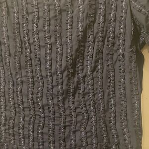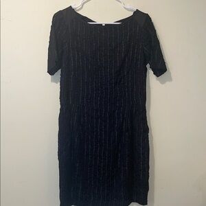Chic black mini dress with textured design. Short sleeves and elegant style. Ideal for versatile wear.