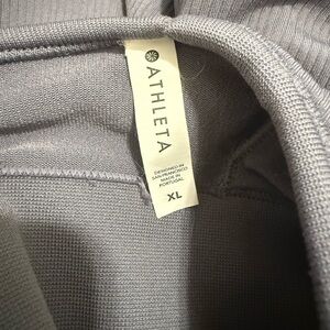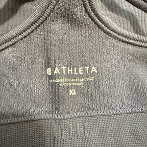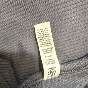 Athleta “Renew Support” ribbed racerback tank top in slate gray (blue gray). Has built in bra with pads included. Excellent condition with no obvious wear or defects noted. Stock photo added to demonstrate fit only.