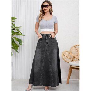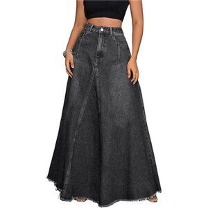Features: Button ang zipper closure, high waist with belt loops, barrel jean skirt, flared a line style, flowy frayed hems, tassels, chic inverted v-shape stitching, two sides slanted pockets and two patchwork back pockets, solid color, full length