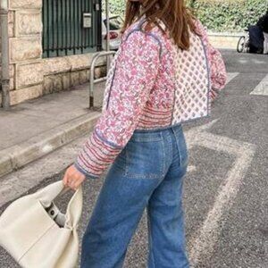 This Women’s Retro Floral Pink and White Quilted Jacket brings vintage charm with modern comfort.