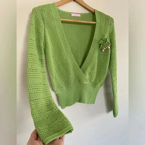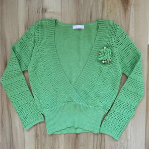 Women’s Retro Vintage Green Knit Crochet Cropped Sweater Deep V-neck