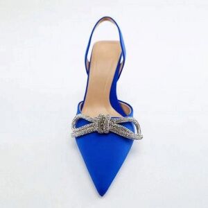 Women's Rhinestone Bow Sling Back Pointed Toe Mid Kitten Heel Shoes