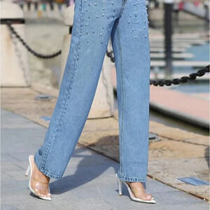 Womens Rhinestone Detail High Waisted Straight Leg Jeans