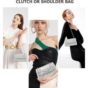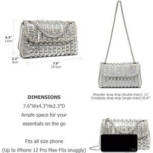 FEATURES: This luxury glitter evening clutch is full of dazzling rhinestones and Pearl, has a main compartment and a small card slot, with durable perforated double chains; and Magnetic snap design makes it more convenient to use. This evening bag will make you a dazzling one on every occasion.
