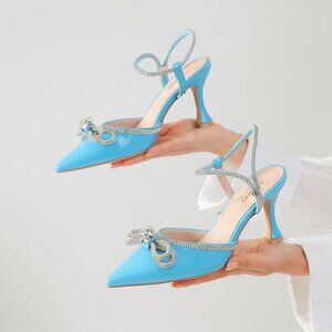 Women's Rhinstone Light Blue Adjustable Strap Bow Closed Pumps Heeled Shoes