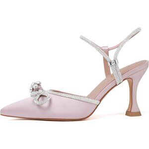 Women's Rhinstone Light Pink Strap Bow Closed Toe Adjustable Pumps Heeled Shoes