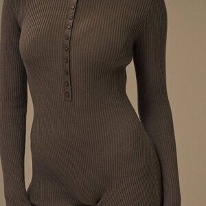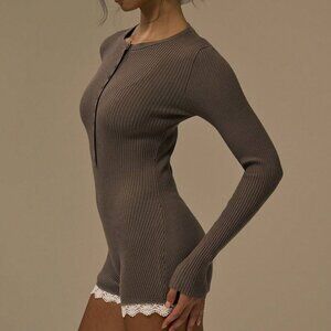 Women's Rib Knit Lace Trim Fitted Long Sleeve Playsuit romper