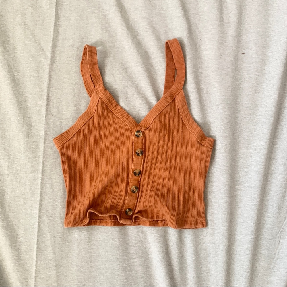 Elevate your style with this chic ribbed button-down tank top. Featuring a warm rust color, it's perfect for any casual outing. Enjoy comfort and style in one piece.
