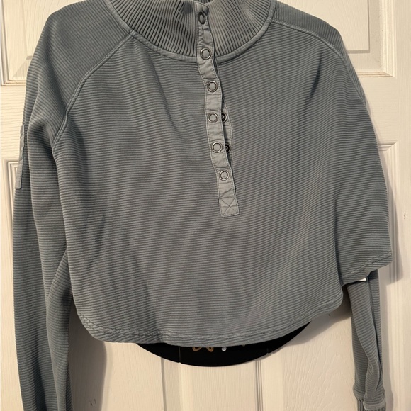 Stylish blue ribbed sweatshirt with button-up design. Cozy and versatile for any wardrobe. Worn twice. Great condition.
