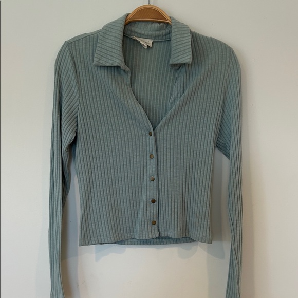 Elevate your style with this chic ribbed button-up top. Perfect for any occasion, this blue top offers both comfort and elegance.